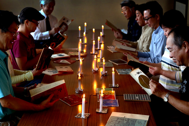 「SRの会」の例会。もちろん、本を読むときにろうそくは立てないが、熱心な読みこみにウソはない=大阪府吹田市、伊藤菜々子撮影