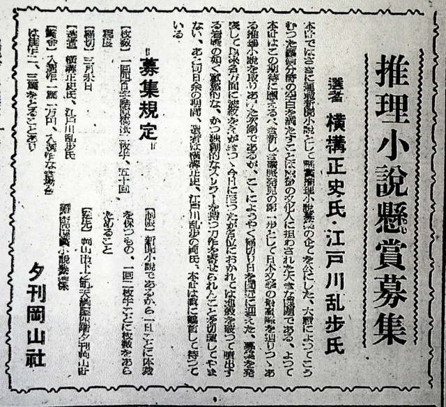 「新聞小説界にエポックメーキング(新時代開拓)を画すために英断をもって、懸賞推理小説の募集を行った」と推理小説を公募し、横溝と乱歩に最終選考を依頼したのは「夕刊岡山社」。選者を「現代推理小説界の雄で県下に在住する横溝正史氏と同小説界の王者江戸川乱歩氏」と紹介している。47年に乱歩が岡田村(現・倉敷市真備町)の横溝宅を訪ねるなど、両氏は交流があった。