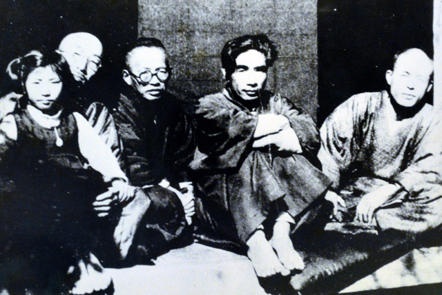疎開宅の横溝正史(右から2人目)。訪ねてきた江戸川乱歩(左から2人目)のひざに抱かれているのは横溝の次女、瑠美さん=1947年11月、倉敷市教委提供