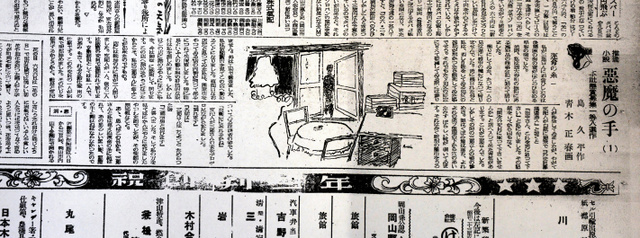 「悪魔の手」新聞連載の初回が載った1948年6月5日付の夕刊岡山の紙面コピー