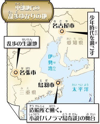 乱歩が少年だったのは明治(めいじ)時代の終(お)わりごろ。名古屋は急速(きゅうそく)な近代化(きんだいか)が進(すす)み、田畑(たはた)や原っぱにいきなり洋館(ようかん)が立ち並(なら)ぶという光景(こうけい)が見られました。こうした世界観(せかいかん)は、小説「パノラマ島奇談(とうきだん)」に色濃(いろこ)く表(あらわ)れています。死(し)んだ金持(かねも)ちになりすましたうり2つの男が、家の財産(ざいさん)を使(つか)って離島(りとう)に自分の理想(りそう)の楽園を築(きず)くストーリー。作家デビューする前、造船所(ぞうせんじょ)の事務員(じむいん)として働(はたら)いた三重県鳥羽(みえけんとば)市が舞台(ぶたい)とみられています。