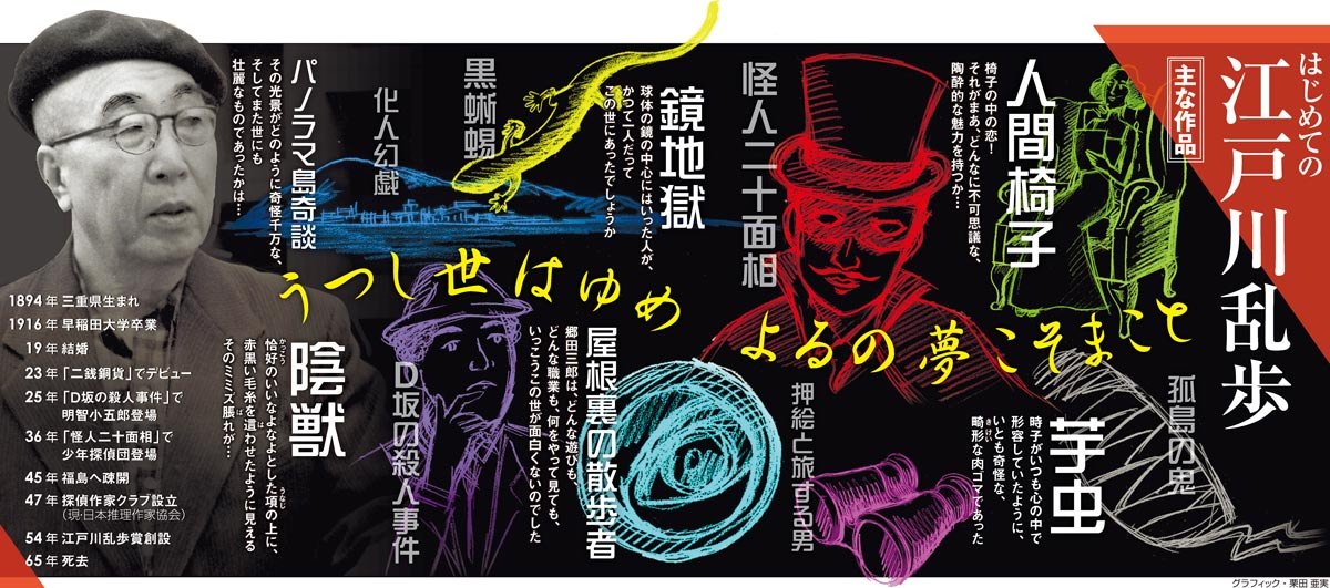 日本の探偵小説の父、江戸川乱歩が今年、没後50年を迎えた。なのに、ああ、なんということでしょう。いまなお多くの文庫に作品が収められ、読み継がれているのです。魅力はいずこに?
