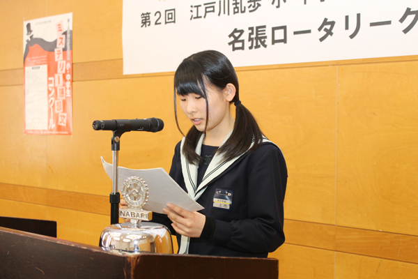 名張ロータリークラブ(尾形雅則会長)が市内の小学4年生から中学3年生を対象に募集していた「第2回江戸川乱歩記念 小・中学生ミステリー感想文コンクール」の授賞式が3月30日、同市南町の市産業振興センターアスピアであり、最優秀賞など10人が表彰された。【感想文を朗読する上市さん=名張市南町で】