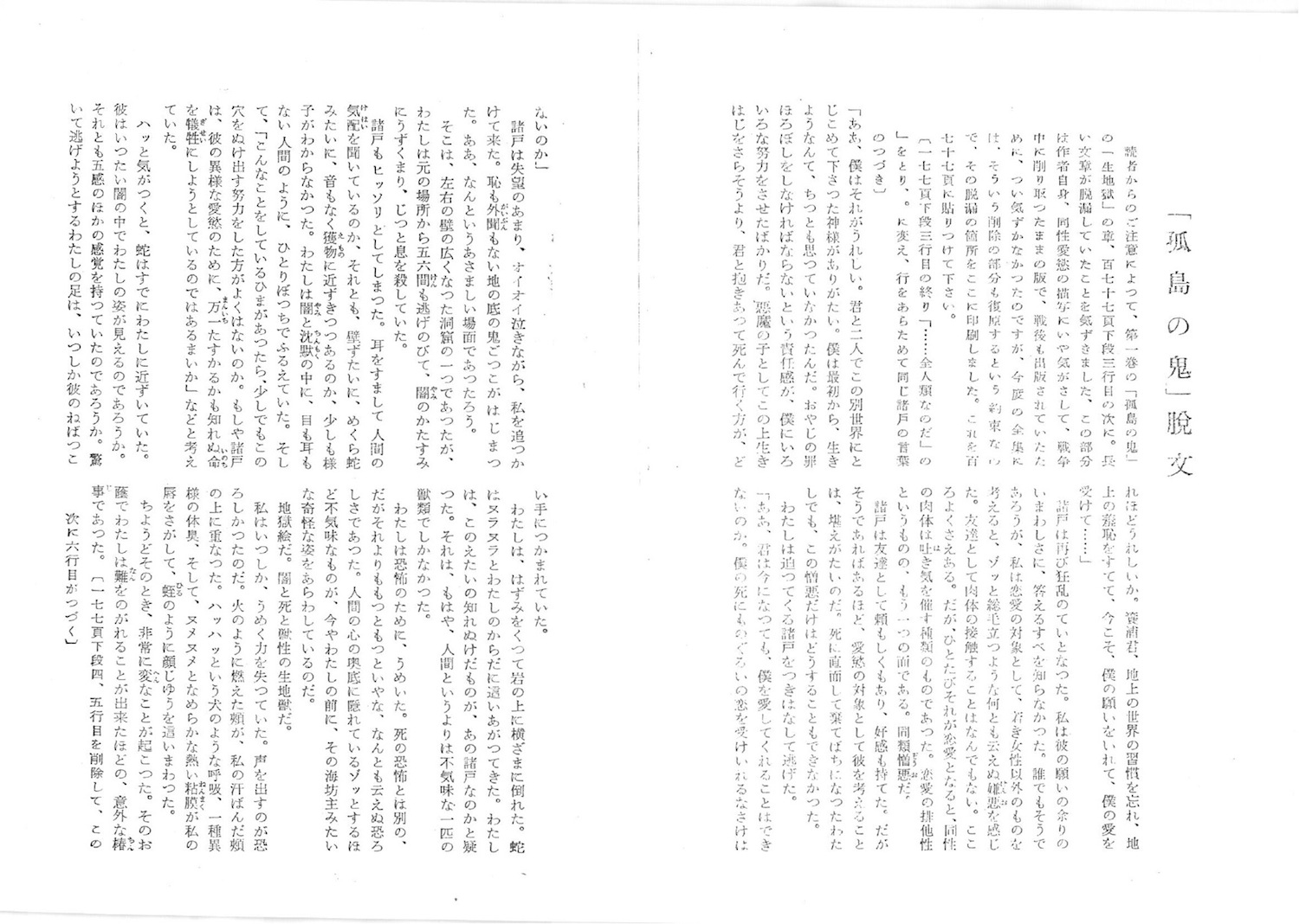 というのも、3月6日付エントリをお読みになって、昭和30年の乱歩全集に附されていた「『孤島の鬼』脱文」をスキャンしてお送りくださったかたがあり、すなわちこれです。