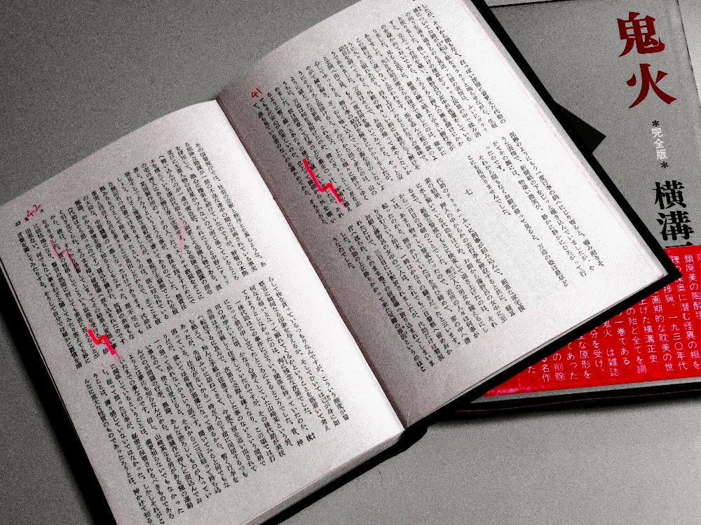いくらネット古書店で最安値の一冊を購入したからといって、蛍光ペンやボールペンや色鉛筆で書き込みをするなんて、なんとも無残なことをしてしまったなあ、といまは思いますが、この本の「鬼火」は、春秋社版にもとづく初刊テキスト全文を収録したあとに、「新青年」の削除ページにおける初出と初刊の異同が示されていて、すなわち完全版と銘打った内容になっていました。