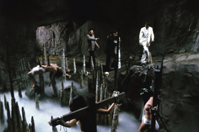 本作を含め、天知茂主演作全25本のうち19本を演出したのは映画黄金期を支えた職人気質の井上梅次監督。京マチ子主演のミュージカル映画『黒蜥蜴』(62)などの乱歩作品を撮り、乱歩とも面識があったことから、製作会社の松竹に請われ、“江戸川乱歩の美女シリーズ”の初代ディレクターを務めた。放送が始まってまだ間もなかった「土曜ワイド劇場」には既成のテレビドラマとは異なる、プログラムピクチャーを思わせる独創的な面白さと猥雑な熱気があった。脚本は、ナイトクラブの専属歌手からシナリオライターへと転職したジェームス三木。“江戸川乱歩の美女シリーズ”では『黒蜥蜴』のリメイク『悪魔のような美女』(79)や夏樹陽子の裸体が眩しい『エマニエルの美女』(80)の脚本も手掛けており、どれも評価が高い。理想郷づくりに主眼が置かれていた乱歩の原作に対し、『天国と地獄の美女』では伊東四朗の片目をくりぬくなどのグロテスク描写を盛り込む大出血サービスぶり。隻眼に対するジェームス三木のこだわりは、のちにNHK大河ドラマ『独眼竜正宗』(87)として結実することになる。音楽は、石井輝男監督のカルト映画『江戸川乱歩全集 恐怖奇形人間』(69)にも参加していた鏑木創。そしてノンクレジットながら、駆け出し時代の三池崇史監督が助監督のひとりとして現場に入っていたことでも知られる。三池監督の自伝『監督中毒』(ぴあ出版)によると、『天国と地獄の美女』の撮影現場で井上監督に仕事ぶりを認められたことで、自分の居場所がつかめ、楽に仕事ができるようになったとある。やはり、パノラマ島は異能な人々が集まる桃源郷であるようだ。