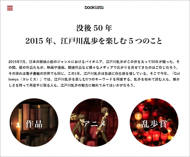 電子書籍関連事業を展開する株式会社ブックリスタ(東京都港区)は、講談社・光文社・東京創元社・早川書房とブックリスタが協同で、ミステリー愛読者へ様々なミステリー作品をご紹介する企画、「Collemys(コレミス)」のサイトにて、江戸川乱歩没後50年特別企画『江戸川乱歩を楽しむ5つのこと』を、本日2015年8月7日(金)より公開いたしました。