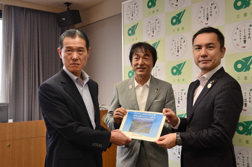 鈴木英敬知事(右)に提案書を提出する岡本栄・伊賀市長(中央)と亀井利克・名張市長=県庁で