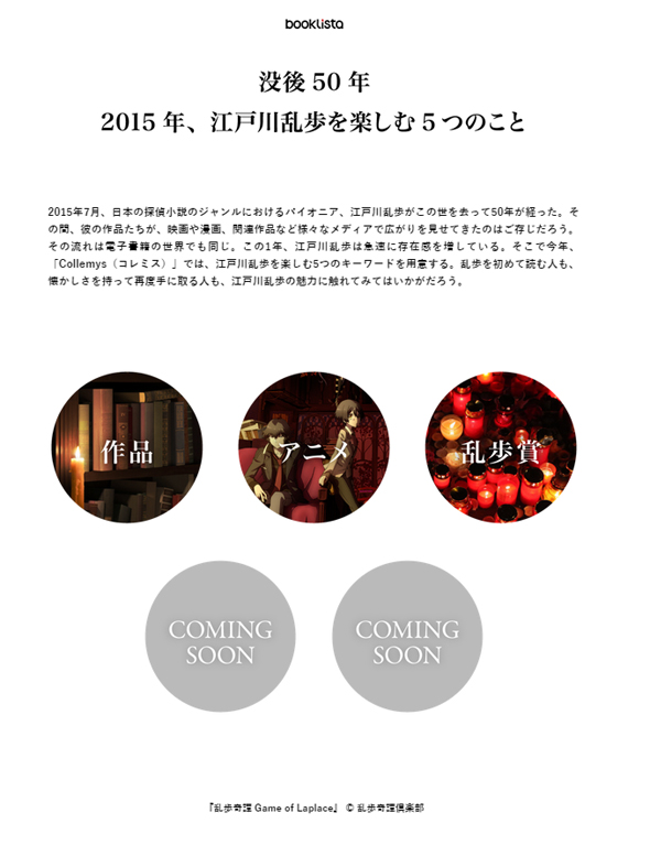 「アニメ」カテゴリーでは、7月に放送が始まった「乱歩奇譚 Game of Laplace」をピックアップ。『人間椅子』『影男』『怪人二十面 相』『パノラマ島』など江戸川乱歩の作品群を原案とし、世界観を現代風にアレンジした各話を原案も交えながら解説している。
