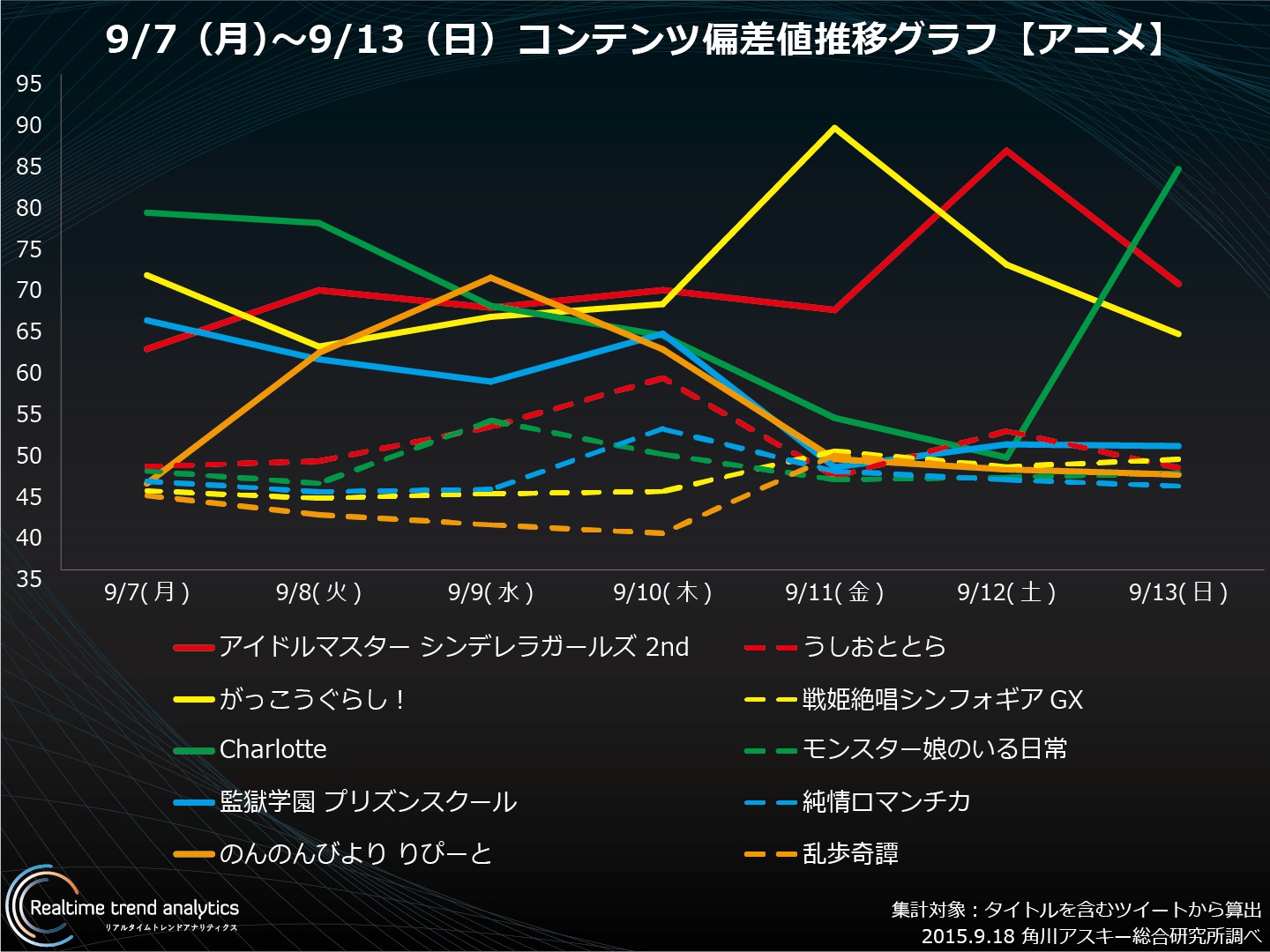 本記事では、9月7日(月)~9月13日(日)のツイート数からコンテンツ偏差値を指標として算出、1週間単位で上位10位を発表する。