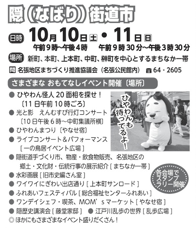 10月10日と11日に、名張市が天下に誇るご町内イベント、隠街道市が催されます。広報なばり9月2号から無断転載。