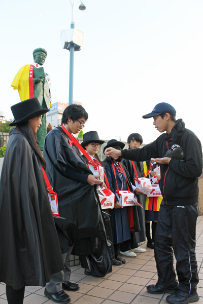 今年は名張高、名張西高、近大高専の3校から9人の生徒が参加した。生徒たちは乱歩の代表作、少年探偵シリーズなどでおなじみの「怪人二十面相」に黒いマントやハットに扮して参加し、改札を通る学校帰りの高校生や社会人に募金の協力を呼び掛けた。