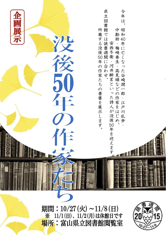 ▼富山県立図書館:企画展示「没後50年の作家たち-谷崎潤一郎・江戸川乱歩を中心に-」