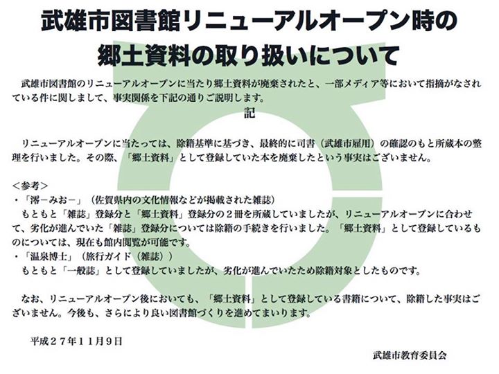 【武雄市図書館リニューアルオープン時の郷土資料の取り扱いについて】 武雄市図書館のリニューアルオープンに当たり郷土資料が廃棄されたと、一部メディア等において指摘がなされている件に関しまして、事実関係を下記の通りご説明します。... https://t.co/UOKt17cuZJ