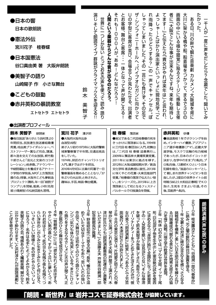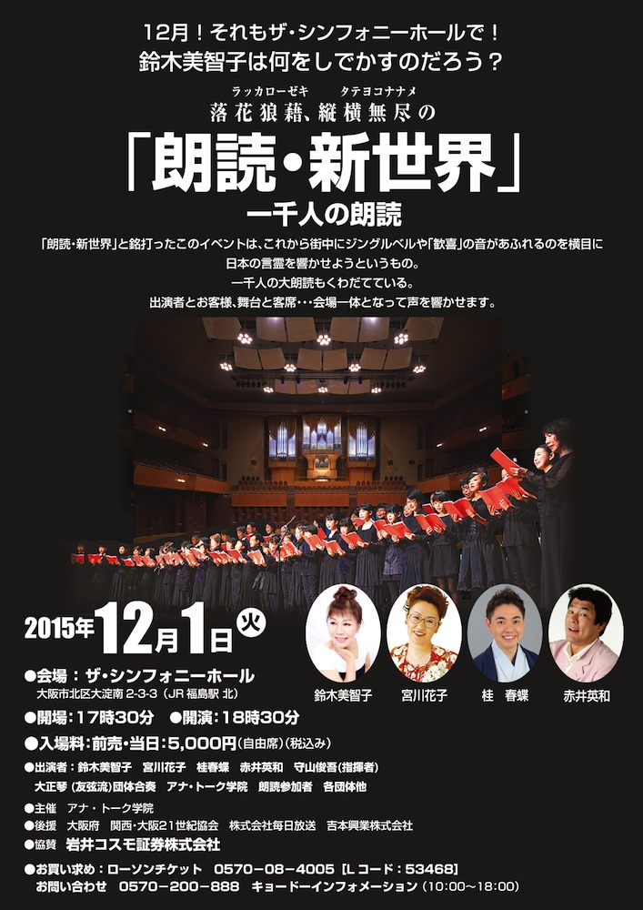▼よしもとニュースセンター:鈴木美智子の「落花狼藉、縦横無尽『朗読・新世界』一千人の朗読」に宮川花子がゲスト出演(2015年12月6日)