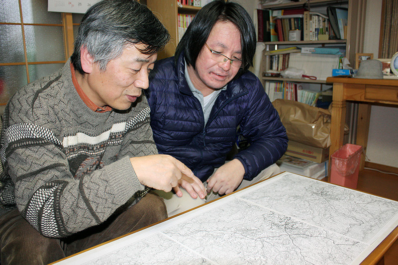 地図を広げて「名張ミステリーライン」への思いを語る小島敏孝さん(左)と上田豊太さん=三重県名張市丸之内で、広瀬晃子撮影