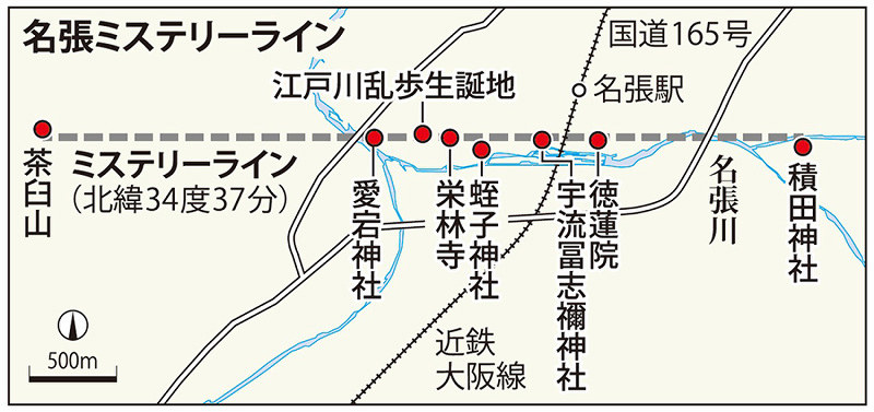 名張市の宇流冨志禰(うるふしね)神社や栄林寺など六つの寺社が北緯34度37分の線上に並ぶ--。この“衝撃的事実”を見つけたのは、元市職員で、市民団体「名張ふるまち応援団」代表の小島敏孝さん(62)=百合が丘。おまけに名張出身の小説家、江戸川乱歩の生家の跡地も線上にあり、「名張ミステリーライン」と命名した。「街おこしで6寺社を訪ね歩くミステリーライン・ウオークを3月に企画したい」と語る小島さんにラインの謎について聞いた。【広瀬晃子】