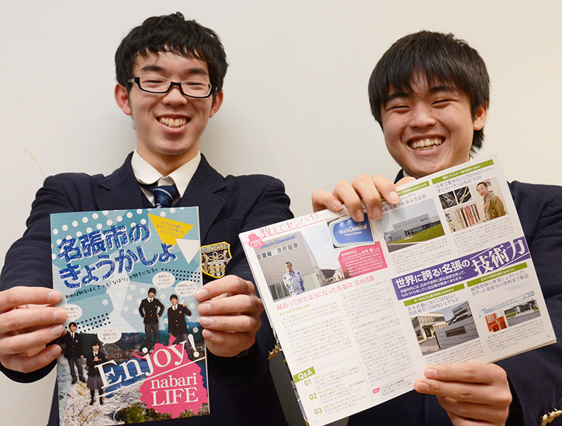 三重県名張市についての魅力をPRする冊子を持つ近大高専の学生=同市春日丘7の同校で、鶴見泰寿撮影