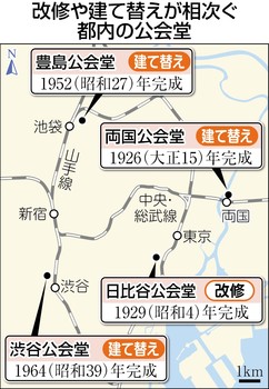 都内では、大正~昭和期に建てられた公会堂の改修や建て替えが相次ぐ。
