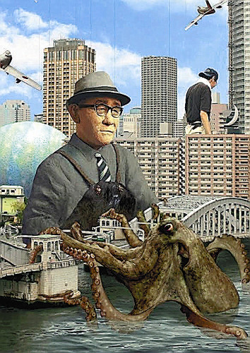 気球から延びた縄ばしごをつかみ、怪盗「怪人二十面相」のように逃亡しようとする江戸川乱歩、特撮映画のスタジオに入り込んだようなウルトラマンの生みの親・円谷英二――。人形を使って撮影した写真作品はどれも、独創性にあふれている。石塚さんは「モデルとなった作家らが見たら、喜びそうなものを作りたい」と語る。