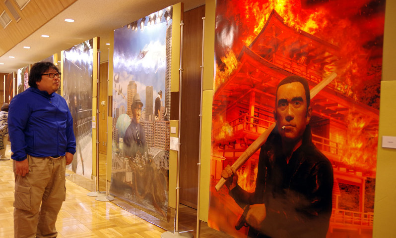 燃えさかる金閣寺をバックにたばこをくゆらせる三島由紀夫。「怪人二十面相」さながら、気球から垂れた縄ばしごにぶら下がり拳銃を構える江戸川乱歩--。石塚さんの作品は、粘土の人形と実写した風景や人物、静物の模型などを巧みに組み合わせて「作家の世界」を表している。