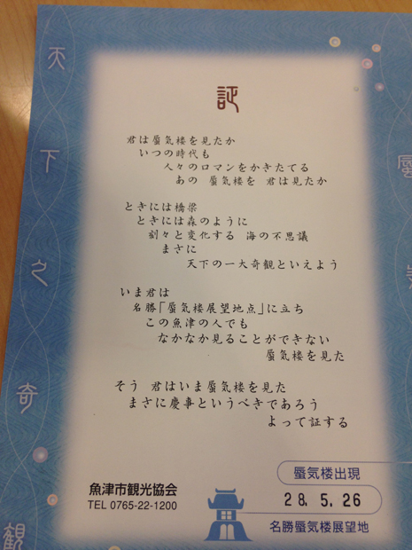 魚津市観光協会による蜃気楼を見たことの証明書