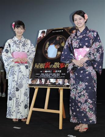 W主演映画「屋根裏の散歩者」の初日舞台あいさつに出席した木嶋のりこ(左)と間宮夕貴は涼しげな浴衣姿で登場=東京・新宿三丁目