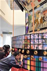 江戸時代に流行した立体紙芝居「のぞきからくり」の展示が23日まで、前橋市の前橋文学館で行われている=写真。江戸川乱歩の小説「押絵と旅する男」の題材としても扱われ、多くの来場者の目を引いている。