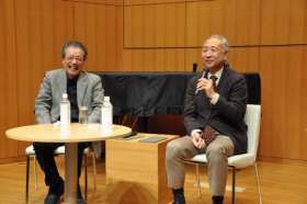 前橋文学館の特別企画展「パノラマ ジオラマ グロテスク―江戸川乱歩と萩原朔太郎」の最終日となった18日、前橋市千代田町の同館で記念のトークイベント「猟奇な二人の病気な話」が開かれ、乱歩の孫で都内在住の平井憲太郎さんと、朔太郎の孫の萩原朔美同館長が対談した。