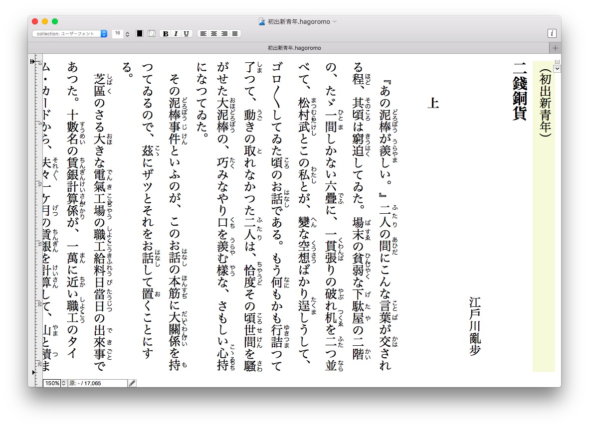 テキストは「新青年」の初出を使用することに決めていたのですが、できるだけ初出のままを再現するべく、Hagoromoで仕上げた原稿のスクリーンショットはこんな感じになっております。