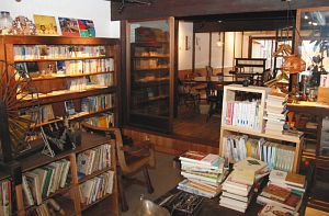 文学を中心に本が並ぶ店内。奥に喫茶スペースがある=名張市中町で