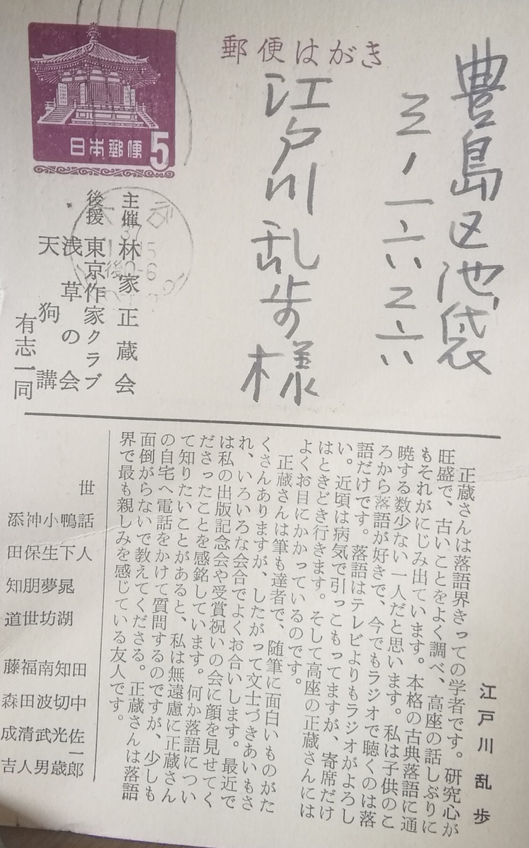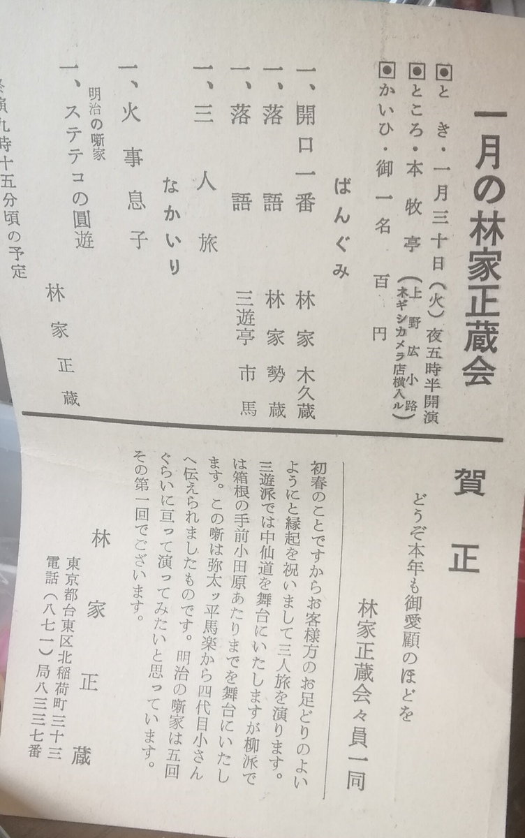 林家正蔵会案内はがき 林家正蔵会